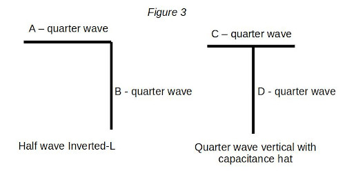 This is illustrated in figure 3. A half wave wire that is erected as an inverted-V has a quarter-wave vertical section (B) and a quarter wave horizontal section (A). If the quarter wave horizontal section is arranged so that it lies centered on top of the quarter wave vertical section, we now have a quarter wave vertical antenna (D) with a capacitance hat (C) that will theoretically be resonant at the same frequency as the half-wave inverted-V antenna.
