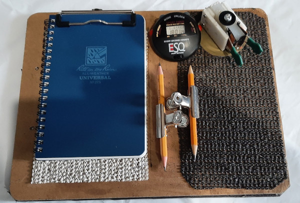 Finally, the board on which everything is mounted is a standard US Letter size clipboard. I moved the clip to where I needed it and glued a thick rubber pad underneath to make it softer on my lap. Now off to the field for another season of outdoor ham radio.