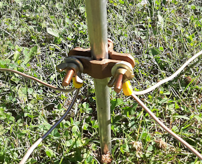 Back to today and 30 degrees Celsius. After a lot of experimentation that consumed another couple of rolls of wire, I had an idea that just might work. If I replace the single raised counterpoise wire with a set of ground-mounted radials, would my antenna still work as well? Here’s the rub (as Shakespeare was fond of writing) ground-mounted radials are slower to setup than a single raised counterpoise wire.