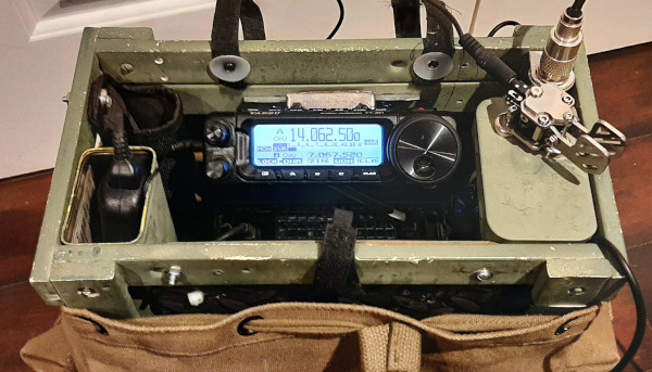 The radio, Bioenno 12AH LiFePO4 battery, paddles and earbuds are all housed in a custom built frame that I made from scrap plastic – I like to custom build my own gear! The frame exactly fits into the rucksack and serves as an operating “table” at just the right height to match a simple camping stool that I carry inside a pack on my back. There is even a small surface (an inverted, painted Altoids tin) on which my paddles are magnetically attached.