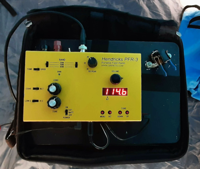 You can see the station details in the pictures. Note my home made Bulldog Clip paddle. I have made several of these; they are actually very smooth and easy to use. Not visible is the battery pack (mounted under the radio). I use three 18650 LiIon cells that seem to last forever. I modified the PFR-3 to accept Anderson Powerpole connectors. I really didn’t like the barrel connector that was originally fitted.