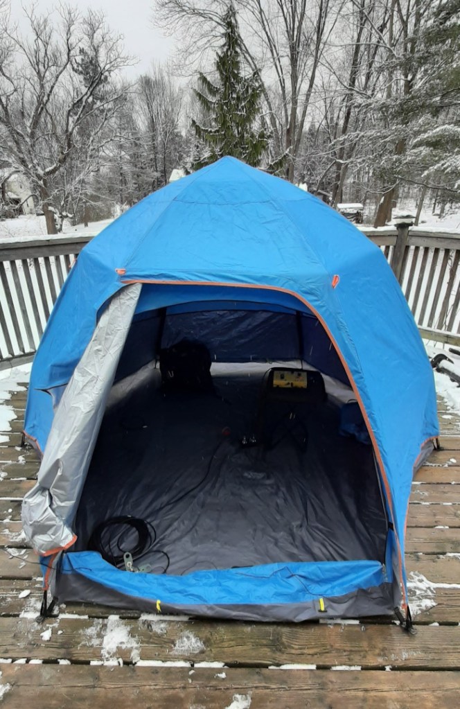 This was the perfect opportunity to test a portable setup I have been planning for outdoor winter radio operations. My shelter is a lightweight pop-up tent that can be carried to the field to provide a wind break and to keep the snow off operator and radio. I cleared the snow from my backyard deck and set up the tent in just a couple of minutes.