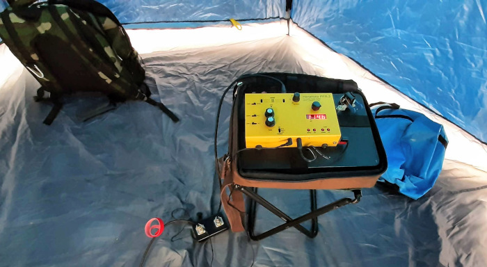 My QRP backpack and a camping stool were dropped inside the tent, then it was time to erect the antenna. I chose a random wire antenna (home made, of course, like all my antennas). I don’t usually like non-resonant antennas, but the PFR-3 has a built in manual tuner with LED SWR indicator so the random wire is a perfect match.