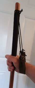 So here is another bushcraft technique I use to achieve the same end. A great hiking aid is a wooden staff. Mine is about five feet long and helps me stay upright while negotiating difficult parts of a trail. I wound a paracord handle on it for comfort. I also attached a paracord loop with a soft canvas wrist protector that serves double duty. The canvas wrist protector opens up to form a pouch. One end of the pouch is secured to the staff, the other end is tied into a slip knot. My hiking staff now becomes a staff slingshot for launching my “sand grenades” up into a tree. The sand grenades are attached to lightweight mason’s twine to pull up my wire.