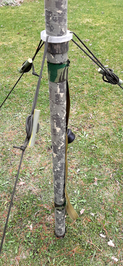 Shelter is in place, lunch has been eaten, now it’s antenna time. Shall it be a vertical antenna or a wire up in the trees? Let’s start with a vertical like the Rybakov. My version of the Rybakov antenna involves suspending 26 feet of wire radiator from a telescoping fiberglass pole, with four 13ft radials on the ground at the base of the pole. The pole is supported by three guy lines held and tensioned by toggles. To prevent the base from slipping when the wind rocks the pole I dig a small divot with my camping knife. The divot is replaced when I tear down the station. The base of the pole sits in the shallow indent in the ground.