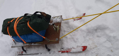 So I built a “radio sled” for hauling my gear out along the trails. It’s good exercise snow-shoeing while pulling the sled and it’s also a heck of a lot of fun.