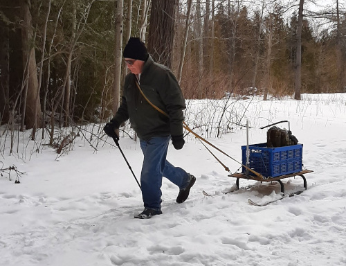 I built one from pieces of tubing scrounged from various sources (a golf cart, a children’s stroller and a kid’s bicycle). The “mule”, as I call it, carries all my radio gear inside a canvas NATO style rucksack. Everything else packs into a backpack that I wear. The backpack attaches to the “mule” handles with small loops of webbing leaving my hands free to use trekking poles to maintain my balance. In winter the “mule” is replaced with a DIY “Radio Sled”.
