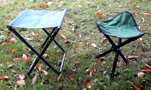 How to comfortably furnish your shelter? Maybe it’s my age but I cannot sit comfortably on the ground while operating my radio; I need a chair! Some of the camping chairs I own sink into the ground when I sit on them. I also find the common folding lawn chairs with nice comfy arm rests unsuitable. They restrict my right arm movement and make my CW keying even more erratic than it normally is. The stool on the left in the picture below is one I use frequently. The 3-legged stool on the right packs up nice and small, but it’s a sinker!