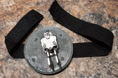 The paddles are leg-mounted on a homemade device made from an elastic strap and a candy tin lid. Hey, it may not be elegant but it works!