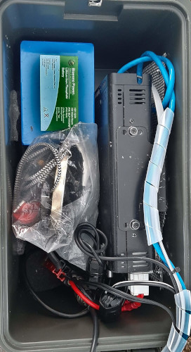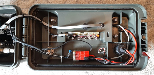 To build the QRO rig, a plastic “50-caliber ammo case” was used, just like the QRP rig. While the QRP rig is entirely self-contained, the QRO rig used to require an external battery. I use a Bioenno 12Ah LFP (Lithium Iron Phosphate) battery that lasts for at least 3 POTA activations at QROp power. I highly recommend Bioenno; their batteries are expensive but very reliable. The battery was too large to fit inside the case, mainly because the body of the FT-891 and an LDG Z11 Pro used up all the space inside.