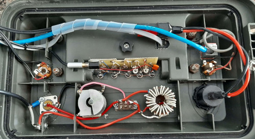 So I decided to replace it with a more compact manual tuner. I have had a lot of success with a home made manual L-match. The LDG autotuner also uses “L” topology and frankly is no faster at finding a match than the new manual L-match. Now the manual tuner AND the battery can be accommodated inside the case and there is also room to store a set of paddles and over-the-ear headphones.
