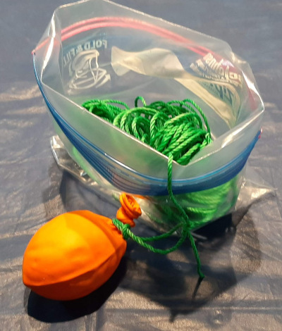 I use my fameless “Sand Grenades” – a plastic party balloon filled with 4 ounces of sand – and a length of Mason’s Twine which is a very cheap, very lightweight, immensely strong and slick type of cordage. I keep the sand grenades and twine in a Ziploc freezer bag which has a secondary use. If the zipper at the top of a Ziploc bag is folded back, the bag becomes self-supporting and serves as a Field Expedient “throw bag” to keep the “throw line” clean and free of dead leaves and other debris.