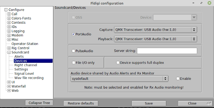 Then under |Fldigi configuration|Soundcard|Devices| select PortAudio and use the scrollbars to select the QMX Transceiver for both Capture and Playback.