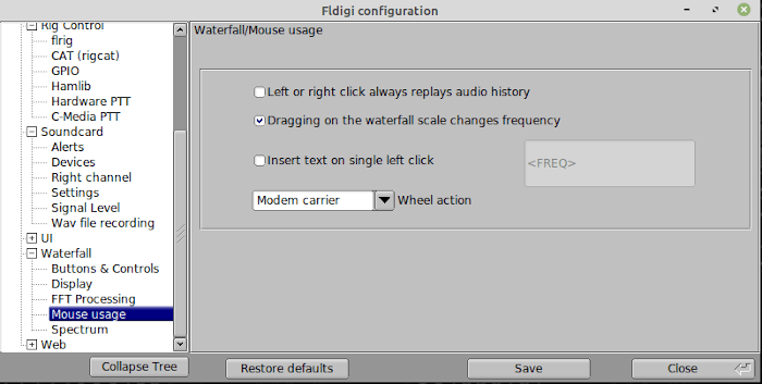 There is one more Fldigi setting you might find useful. Under |Fldigi configuration|Waterfall|Mouse usage| select “Dragging on the waterfall scale changes frequency”. Of course you can click on any signal on the waterfall then click the QSY button to change frequency, but its useful to drag the frequency scale above the waterfall to move to an adjacent part of the band.