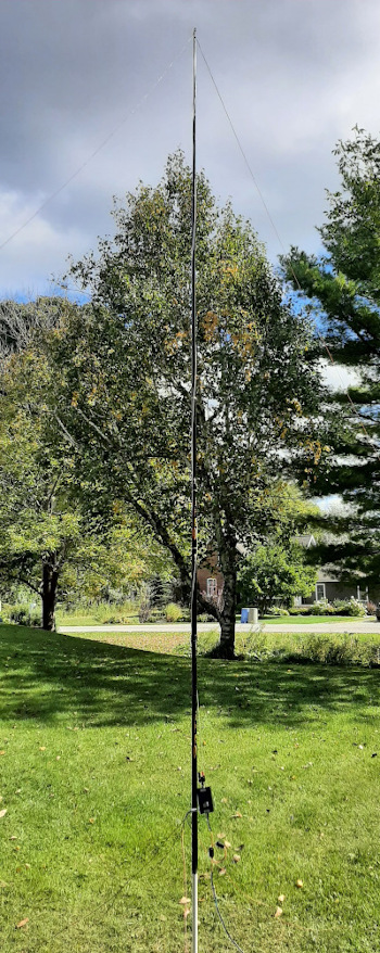 The Ham Radio Outside the Box version deviates from a traditional T-antenna in one respect. The horizontal element (a capacitive top hat) is usually flat, but I needed to use only one support so I modeled the “Titanic” with an inverted-V top hat instead. In order to bring down the SWR, the top hat wire had to be lengthened a little. W7WLM’s version recommended a top hat length of 27 feet. My version ended up at 28 feet.