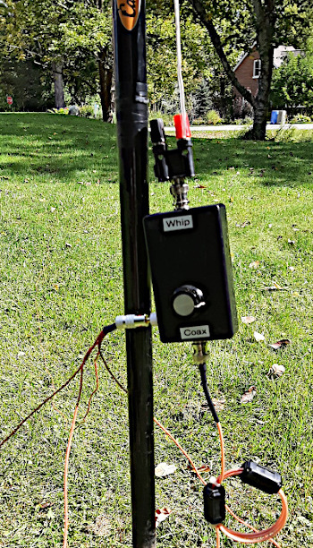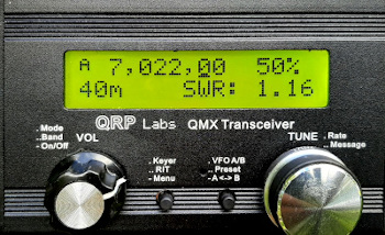 I have the perfect device for providing this base loading. It is the variable inductor from a “Miracle Whip” antenna (no longer in production). It is only suitable for QRP but it is extremely lightweight and compact enough to slip into a pocket in my backpack. This device got the job done. I measured the SWR at the end of a 25ft coax using my QRP Labs QMX transceiver (see image below) at 1.16:1.