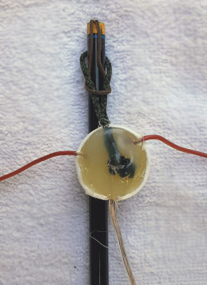 Construction could hardly be simpler. Three wires were cut; 2 x 14ft wires for the top hat and 1 x 12ft wire for the radiating element. All three wires were soldered together and potted inside a small plastic water bottle cap using hot-melt glue. I used a slightly heavier gauge wire for the radiating element because it carries quite a high current. A small loop of thin cord was also hot-melt glued into the wire junction. The top of my pole has a similar small loop of thin cord. Mounting the antenna to the pole is accomplished by threading the antenna’s loop through the pole’s loop and slipping it over the top of the pole. This simple arrangement makes it very quick and easy to mount and dismount the antenna.