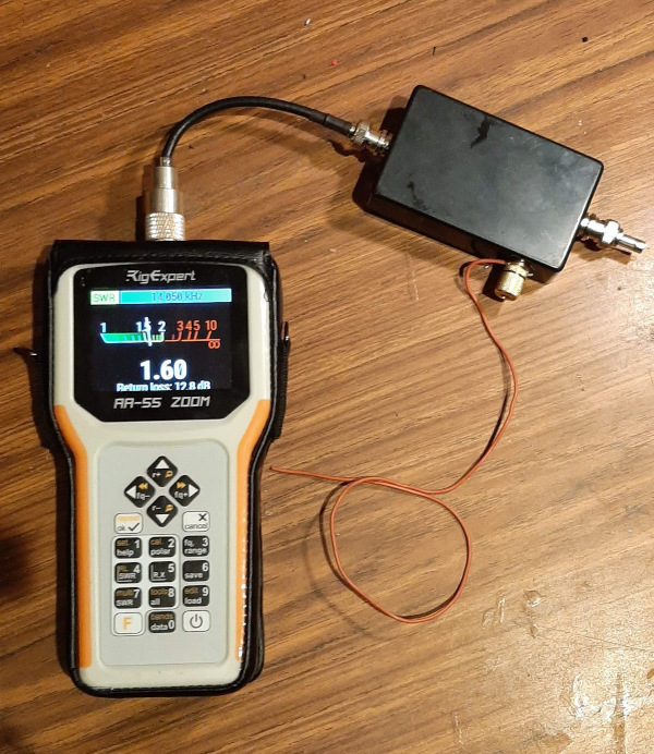 The short counterpoise wire hangs from the connector on the side of the project box.