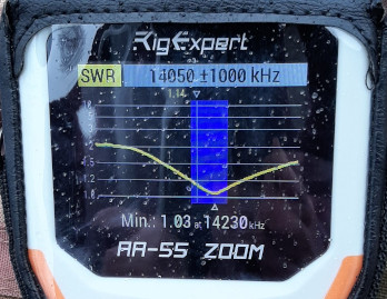 I put everything together outside. The weather at my home QTH has been typical for this time of year; temperature hovering around freezing and precipitation varying between snow, sleet and freezing rain. I grabbed an opportunity between periods of sleet to rush outside with my complete backpack station, erected the CLEFHW, hooked up the RigExpert and … another sleet shower came down. Fortunately RigExpert provides a nice protective cover for its antenna analyzer that protects it from light moisture so I went ahead with the test.