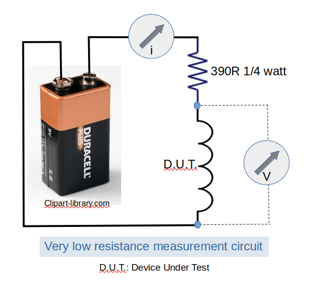 We can think outside the box again and tackle the problem another way. If we pass a current through the coil and then measure the voltage drop across the coil we can find its resistance by a simple application of Ohm’s Law. Fortunately the same Klein Tools MM325 DMM has much better current and voltage ranges. It can measure voltage down to the 200 millivolt range and current down to the 200 microamp range. The following simple circuit was constructed to conduct those measurements.