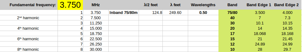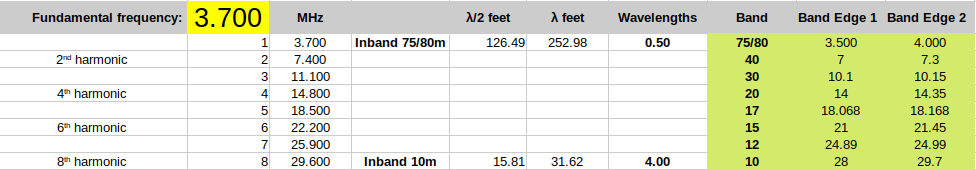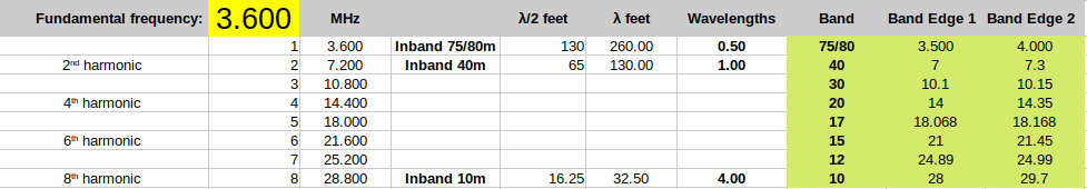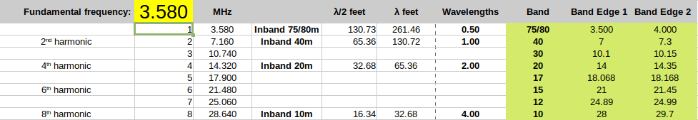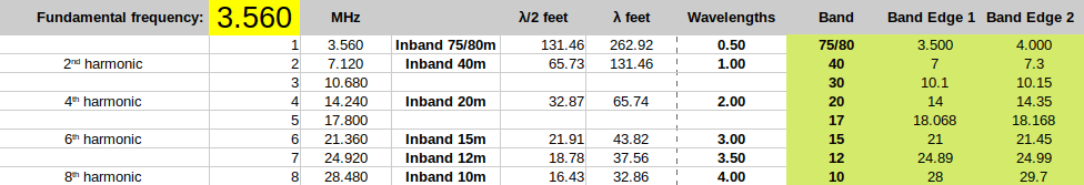 In the chart above the bold vertical black line marks the origin frequency at each harmonic. Each HF band is then presented relative to the harmonic frequency. We can see that the 30m band is way out in left field while the 12m band is a near miss. In fact, if we cut our wire for a half-wave at 3560KHz something magic happens: