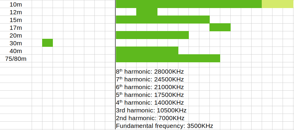 The band width chart suggests that we have very little expectation of finding a harmonic relationship between a wide band such as 75/80m and other bands – especially the WARC bands. Surprisingly, despite being the widest band, even 10m does not align too well.
