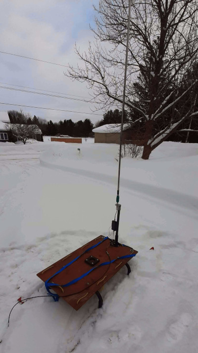 My fameless DIY radio sled sits outside the shelter and, in addition to carrying all my gear out onto the tundra, acts as a support for the antenna. For this deployment I set up my CLEFHW (Coil-Loaded End-Fed Half-Wave) 20m antenna.
