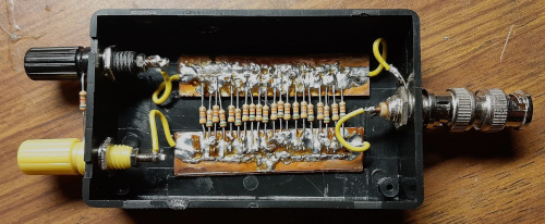 I built the dummy load using 10x47K and 10x56K resistors all in parallel. The resistors have a tolerance of 10% and the final product measured 2500 ohms. Note the binding posts on the left in the picture above. These allow extra resistors to be added. For example, adding 6800 ohm in parallel with the 2500 ohm dummy load yields 1800 ohms. This allows me to experiment with various dummy load resistances.