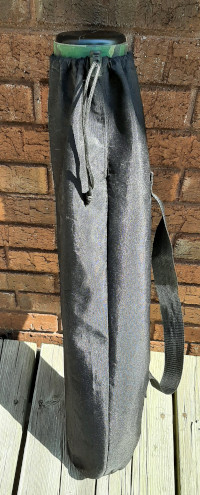 First, in transit, I pack it inside a length of 2-inch (50mm) PVC plumbing pipe. That all goes inside an expanding document tube which, in turn, goes inside a carry bag previously used for a camping chair. The bag is also used for packing tent pegs and guy lines.