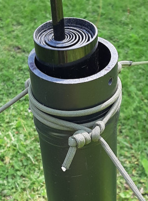The top of the support tube has a small section of enhanced diameter created by slipping several strong rubber bands covered in electrical tape. It’s purpose is to prevent the guy lines from slipping – simple and effective. The guy lines made from 550 paracord are secured using Canadian Jam knots. I have no idea why Canada is credited with this particular style of knot, but it is a very secure way of tightening a guy line around the support tube. Canadian Jam knots are also very easy to release when it is time to pack up the station.