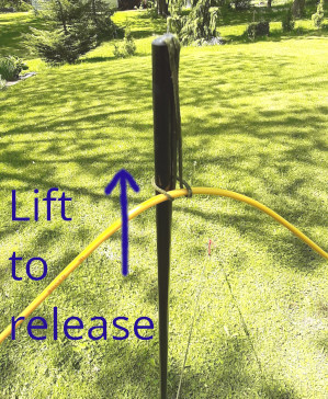 The loop can be wrapped around an antenna wire, then slipped over the top of the mast as seen in the picture. To remove the wire I simply lift the wire above the top section of mast to release it quickly and easily.