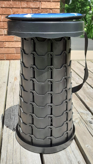 My Putikeeg CW key has very strong magnets on its base and holds very securely to the steel case. I use it in vertical fashion, with the paddles peeking up above the rim of the steel case. The assembly sits at a very comfortable height for operating the radio without the need for a table. My seat is a lightweight, plastic, telescoping thing with a padded cushion on top. It is an ingenious design with many latches holding it up. I was very cautious about trusting my posterior atop this perch at first, but it supports my weight just fine. The pictures tell a lot more than many more words can convey.