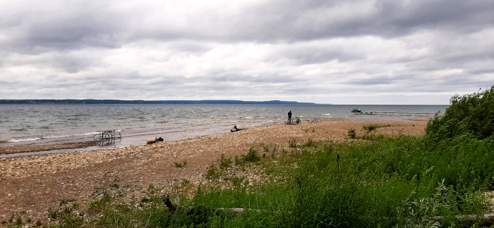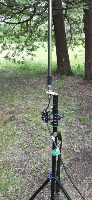 Saturday’s erection was on a grassy area about 100 feet from the lake, but on Sunday the same antenna was standing above a couple of inches of freshwater at the edge of the lake. When I powered up the radio the SWR was a horrifying 3:1. To bring the SWR down to less than 1.5:1 I had to shorten the whip quite considerably. I was surprised that the freshwater of Georgian Bay had such a strong effect. Maybe the thousands of tons of salt recently delivered by ship to the nearby Port of Owen Sound was responsible, who knows.