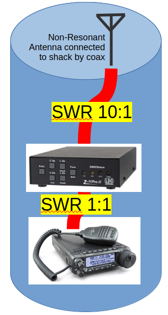 The transceiver may “see” a perfect match coming from the “tuner”, but that low SWR exists only between the “tuner” and the radio. The SWR between the antenna system and the “tuner” might, in fact, be as high as 10:1! Like many other tuners, my LDG Z-11 Pro can resolve impedance mismatches up to 10:1.