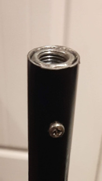 To achieve this it was necessary to fix a 3/8×24 coupling nut inside the top end of the top tripod tube. I guess I got lucky here because one of the coupling nuts in my junque drawer turned out to be a nice snug fit inside the tube. But a snug fit isn’t good enough for an electrical connection so a tiny hole was drilled through the tube and coupling nut. A small nut and bolt was then added to ensure a tight fitting. For good measure, the outside surface of the coupling nut was coated with conductive grease to reduce the electrical resistance and prevent corrosion during use outdoors in the Big Blue Sky Shack.