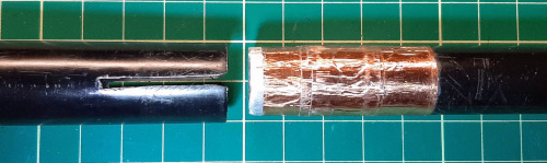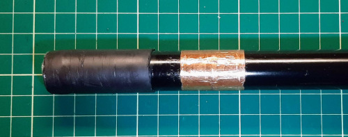 Now it was only necessary to use layers of copper tape to create a slight bulge at the bottom end of the top section of tube, where it mates with the center section. When the antenna is erected the copper tape bulge in the top tube engages with the compressed slits in the center tube and form a secure electrical connection.