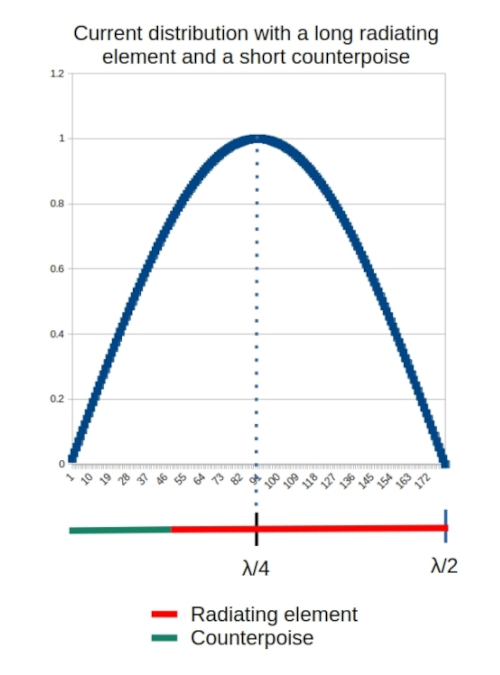 We would like the high current point to lie within the radiating element, not the counterpoise. For the purposes of this discussion we are going to refer to the two radial wires as “the counterpoise”.