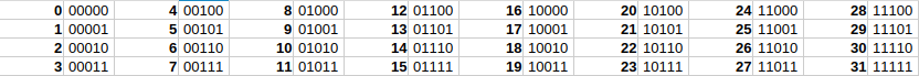 It’s an old joke but it’s quite true. In the binary system there are only two digits to remember: “1” and “0”. We can count from decimal 0 to 31 using only 5 binary digits.