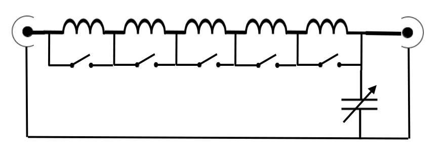 Therefore, with only 5 inductors: 0.5uH, 1.0uH, 2.0uH, 4.0uH and 8.0uH we can select up to 32 values of inductance by binary operation of the switches (NB: “u” in this post represents the Greek letter “mu”, uH referring to microhenries). Inductance values can be selected in increments of only 0.5uH for fairly precise tuning.